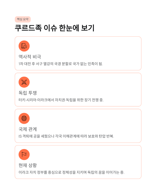 - 현재 상황: 이라크 자치 정부를 중심으로 정체성을 지키며 독립의 꿈을 이어가는 중.