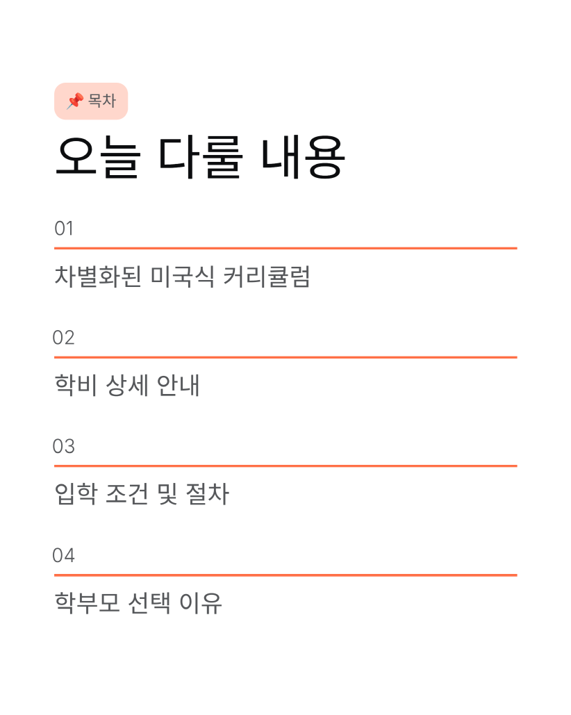 - 커리큘럼: 자율성과 창의성을 존중하는 체계적인 미국식 교육